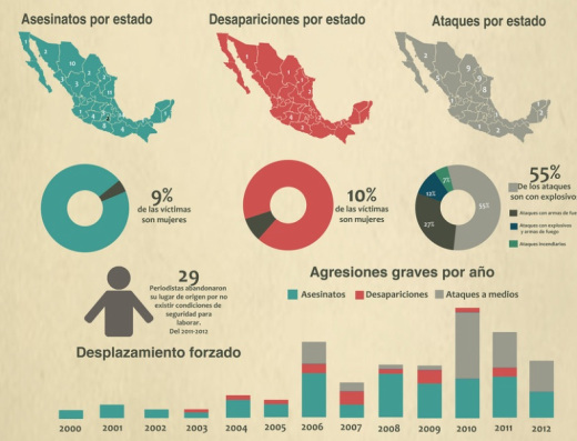 De acuerdo con una investigación realizada por Artículo 19, en el 2013 cada 26.5 horas fue violentado un periodista en el país. Asimismo las cifras revelan que, en dicho año, se registraron 300 agresiones contra periodistas e instalaciones de algunos medios de comunicación. Actualmente, México es considerado uno de los países más peligrosos del mundo para ejercer dicha profesión.